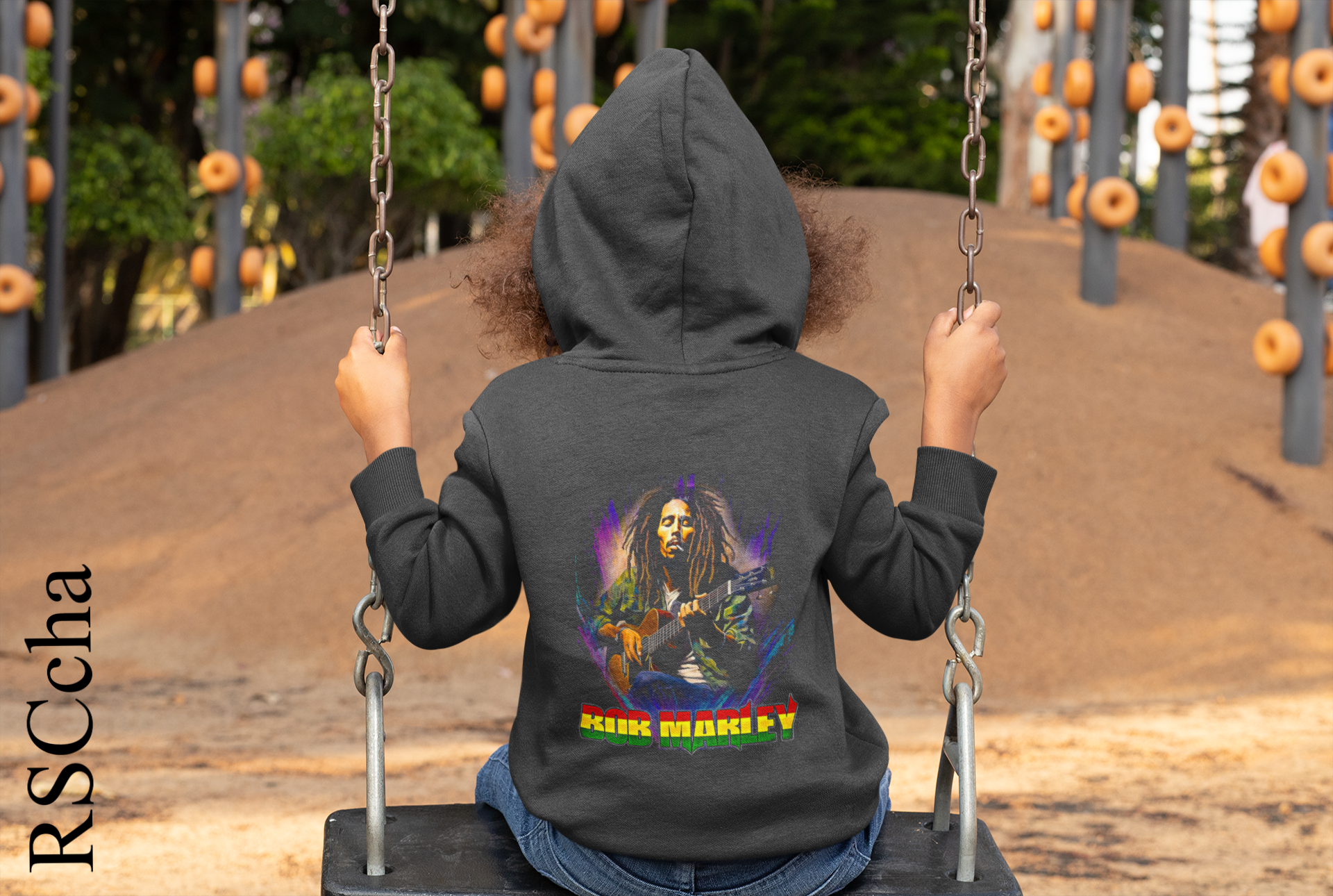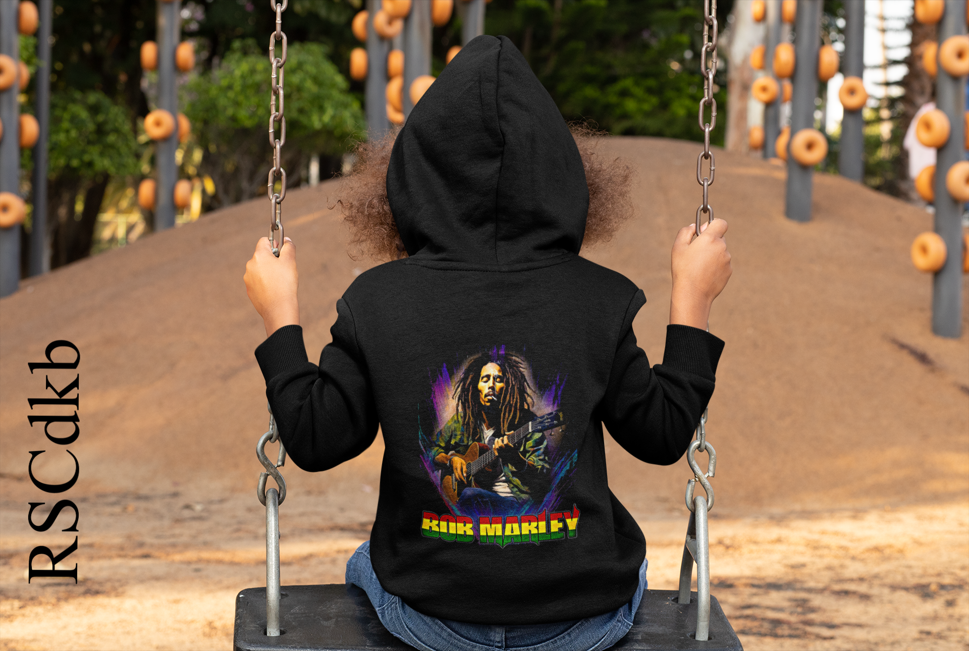 This children’s hoodie features a bold tribute to Bob Marley, blending comfort with vibrant style. Made in a classic navy blue, deep black, and charcoal grey, the back showcases a colourful graphic of Bob Marley playing guitar surrounded by bright, artistic accents. Beneath the design, “BOB MARLEY” is printed in large, multicolored letters, giving it a lively and eye-catching look. The hoodie combines casual playground wear with a nod to reggae culture, making it both fun and expressive for kids.